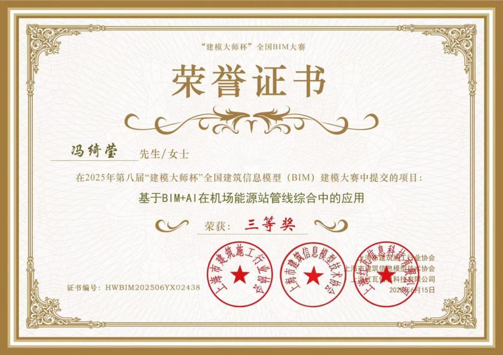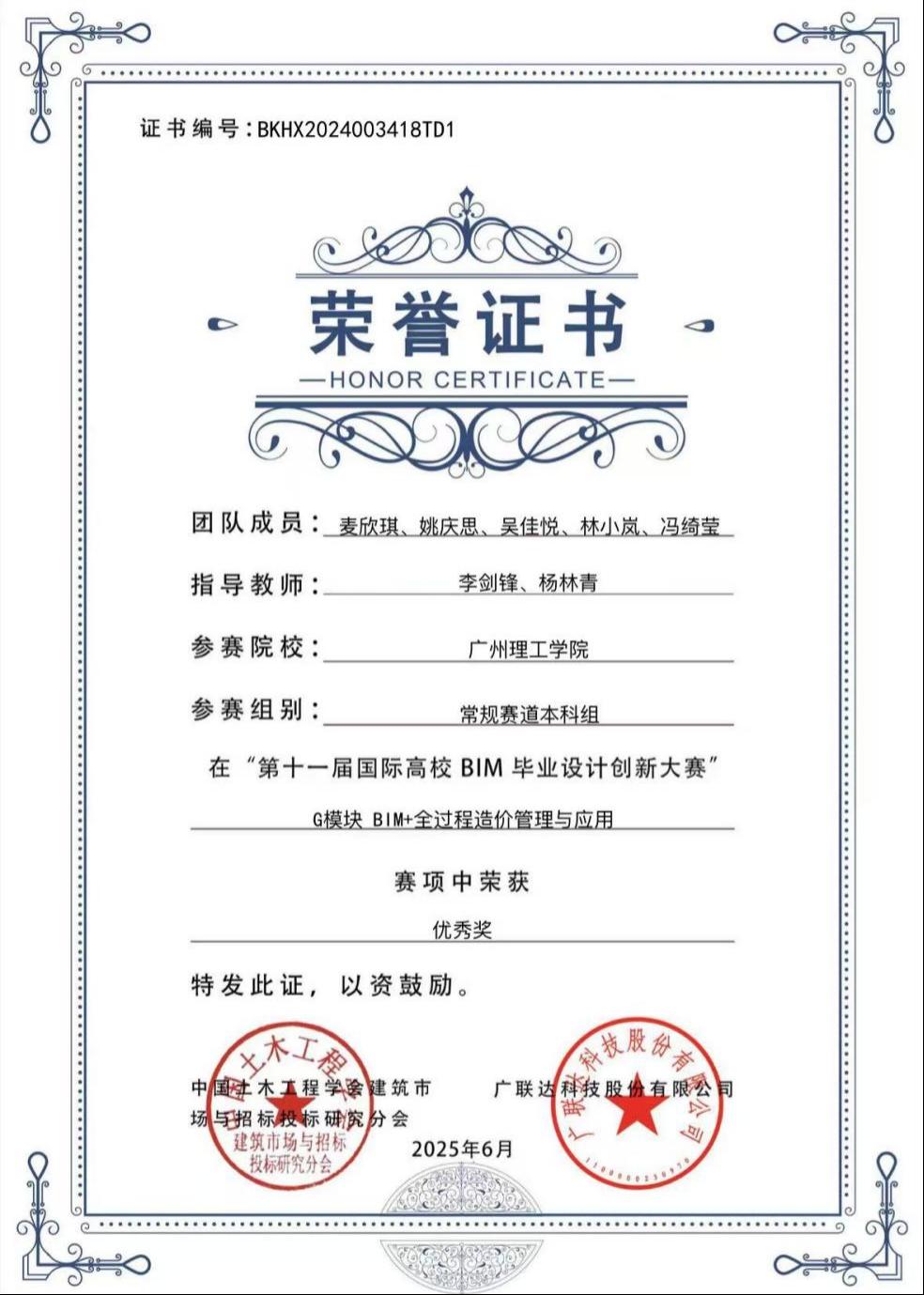 冯绮莹:工程造价专业,取得第八届全国BIM大赛获省赛三等奖、第十一届国际高校BIM毕业设计大赛获国赛优秀奖,持续深造Python与AI大模型知识。