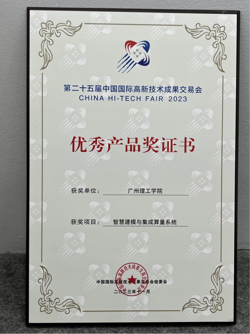 2023年广州理工学院建筑工程学院在第二十五届中国国际高新技术成果交易会(简称高交会)参展科研成果中,智慧建模设计与集成算量系统荣获了“优秀产品奖”。